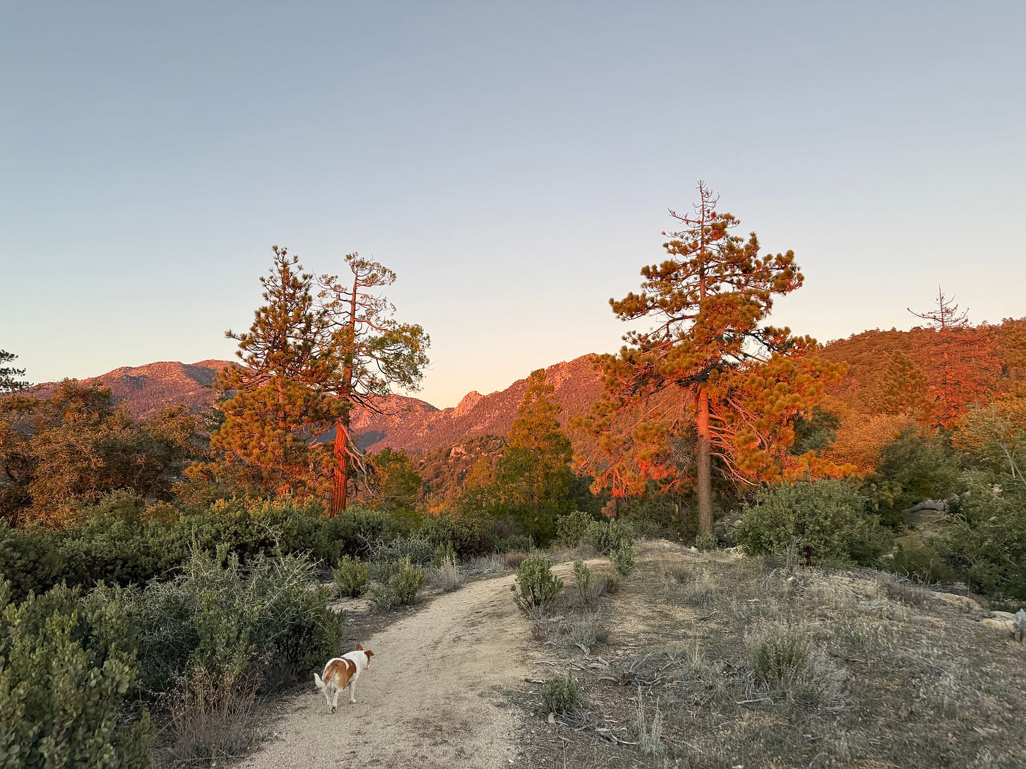 I think about this as I walk, noticing the rotting leaves on the wet earth. The petrichor smell I love comes from those rotting leaves, I think, as I watch Eliza shake the rain off then squint up at the sky. It’s pouring. She stares at me intently then turns back towards the car, looking back over her shoulder, as if to say ‘let’s go home’. I’m soaked through-- I left my raincoat in London, assuming we’d have snow in the mountains by now. Still, I tell her no. We keep going. I have THOUGHTS to PROCESS and need to be moving to do that.